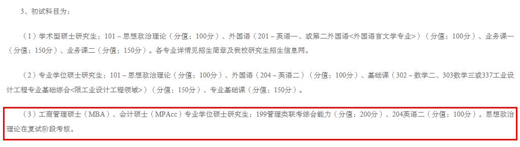 管理學學術學位類:初試考試科目一般為英語一、數學三、政治、加上一門專業課。初試分數構成為英語滿分100分,數學滿分為150分,專業課滿分150分。以浙江工商大學為例: