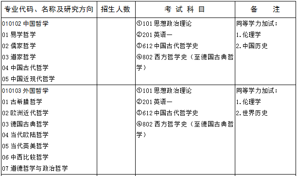 哲學學科門類考試科目:初試考試科目一般為政治、英語一,加兩門專業課,專業課基本上是招生單位自主命題,查看報考學校公布的碩士專業目錄或者考試大綱、參考書目即可了解初試科目。分數構成為政治滿分100分,英語滿分100分,專業課一滿分150分,專業課二滿分150分,總分為500分,以山東大學為例: