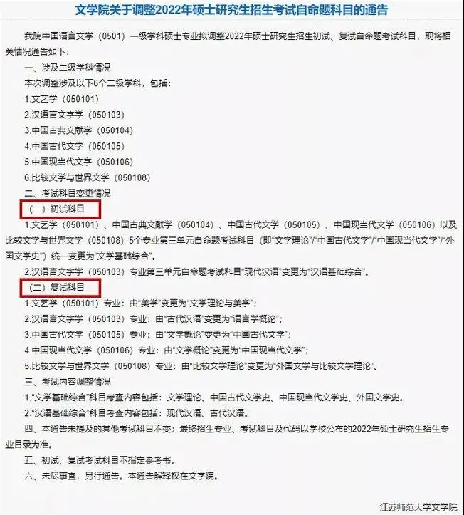 我院中國語言文學(0501) 一級學科碩士專業擬調整2022年碩士研究生招生初試、復試自命題考試科目,現將相關情況通告如下: