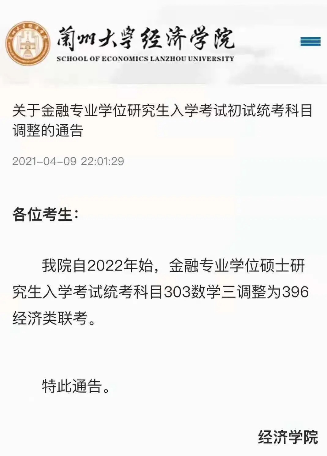 關于金融專業學位研究生入學考試初試統考科目調整的通告:我院自2022年始,金融專業學位碩士研究生入學考試統考科目303數學三調整為396經濟類聯考。