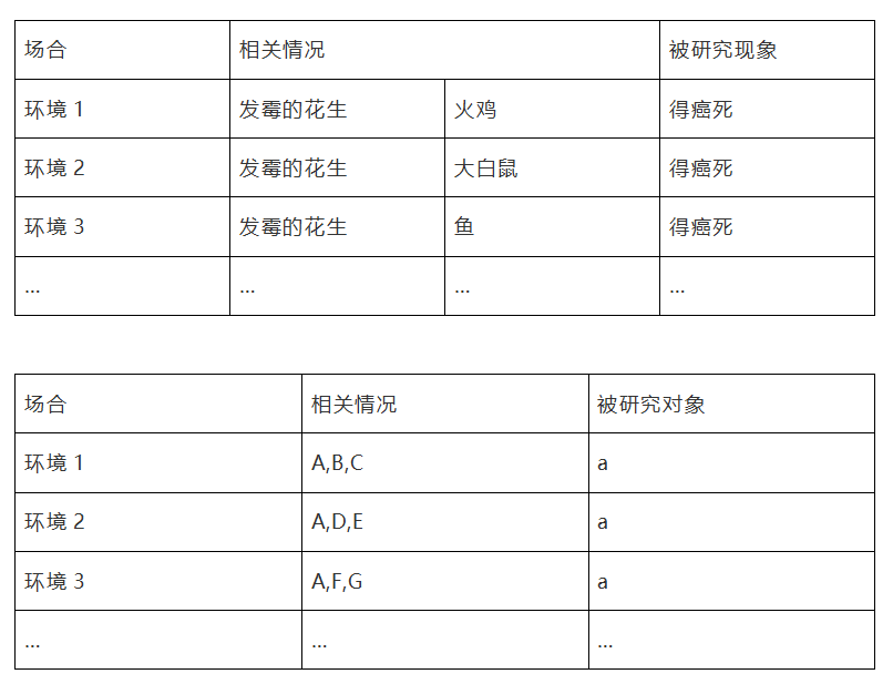 1960年,英國某農場十萬只火雞和小鴨吃了發霉的花生,在幾個月內得癌癥死了。后來,用這種花生喂羊、貓、鴿子等動物,又發生了同樣的結果。1963年,有人又用發了霉的花生喂大白鼠、魚和雪貂,也都紛紛得癌而死,上述各種動物患癌癥的前提條件中,對象、時間、環境都不同,唯一共同的因素就是吃了發霉的花生。于是,人們推斷:吃了發霉的花生可能是這些動物得癌死亡的原因。后來通過化驗證明,發霉的花生內含黃曲霉素,黃曲霉素是致癌物質。這就是“求同”。