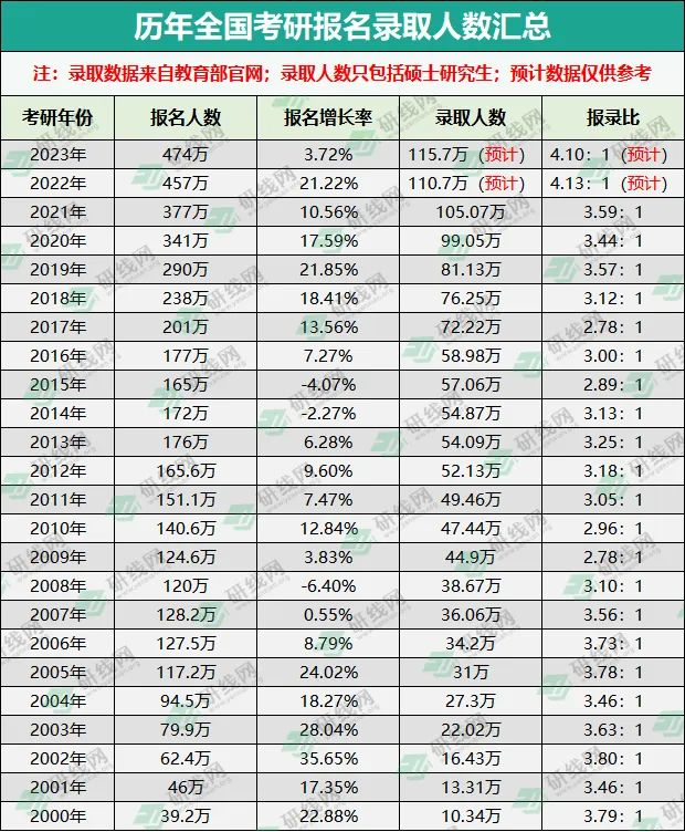 官方數據顯示,2022年考研報考人數457萬,除以碩士生招生人數110.35萬,可以得出2022年考研報錄比為4.14:1。