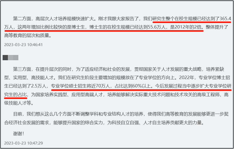 “2022年,專業學位博士招生已經達到了2.5萬人,專業學位碩士招生將近70萬人,占比達到60%以上。今后發展過程當中逐步擴大專業學位研究生的占比。”