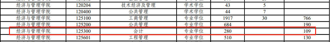 會(huì)計(jì)碩士報(bào)考人數(shù)為280;錄取人數(shù)為109,綜合計(jì)算,報(bào)錄比為:3:1