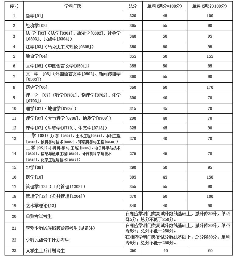 繼2020考研國家線公布后,34所自主劃線院校也陸續公布分數線,蘭州大學公布了2020年碩士研究生招生復試基本分數線,如下所示: