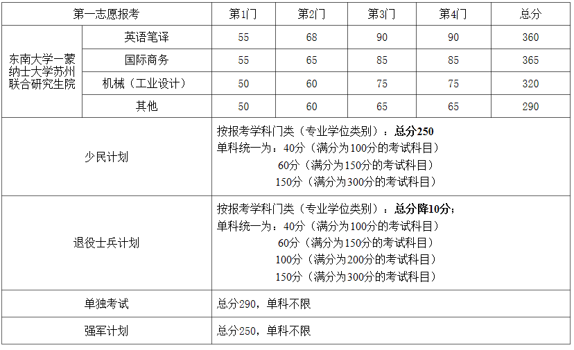 2. 統考考生(不含報考蘇州聯合研究生院考生和管理類聯考考生)總分超過報考專業復試線20分以上,單科(限一門)可降2分。
