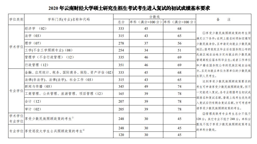 2020考研分數線:云南財經大學2020年碩士研究生招生考試考生進入復試的初試成績基本要求