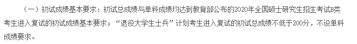 (一)初試成績基本要求:初試總成績與單科成績均達(dá)到教育部公布的2020年全國碩士研究生招生考試B類考生進(jìn)入復(fù)試的初試成績基本要求;“退役大學(xué)生士兵”計(jì)劃考生進(jìn)入復(fù)試的初試總成績不低于200分,不設(shè)單科成績要求。