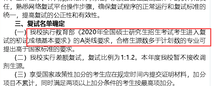 (一)我校執(zhí)行教育部《2020年全國碩士研究生招生考試考生進(jìn)入復(fù)試的初試成績基本要求》的A類線要求,合格生源數(shù)多于計(jì)劃數(shù)的專業(yè)可提出高于國家標(biāo)準(zhǔn)的要求。
