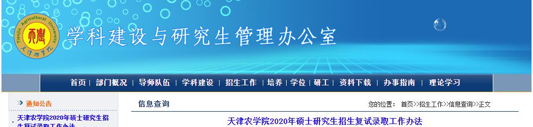 學校網站研究生教育頁面將按時公布各學院調劑系統開放時間、復試考生資格名單、擬錄取考生信息,網址http://yjs.tjau.edu.cn。