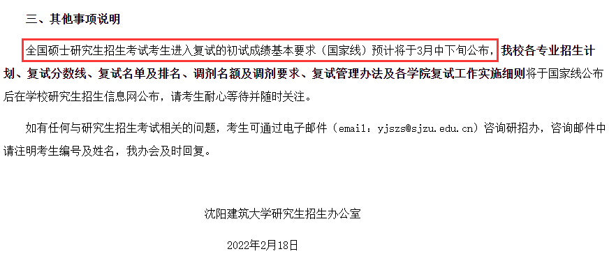 以上就是小編整理的“2022考研分數線:沈陽建筑大學碩士研究生招生考試初試成績預計將于3月中下旬公布"的全部內容。想了解更多考研相關信息,請持續關注本網站。