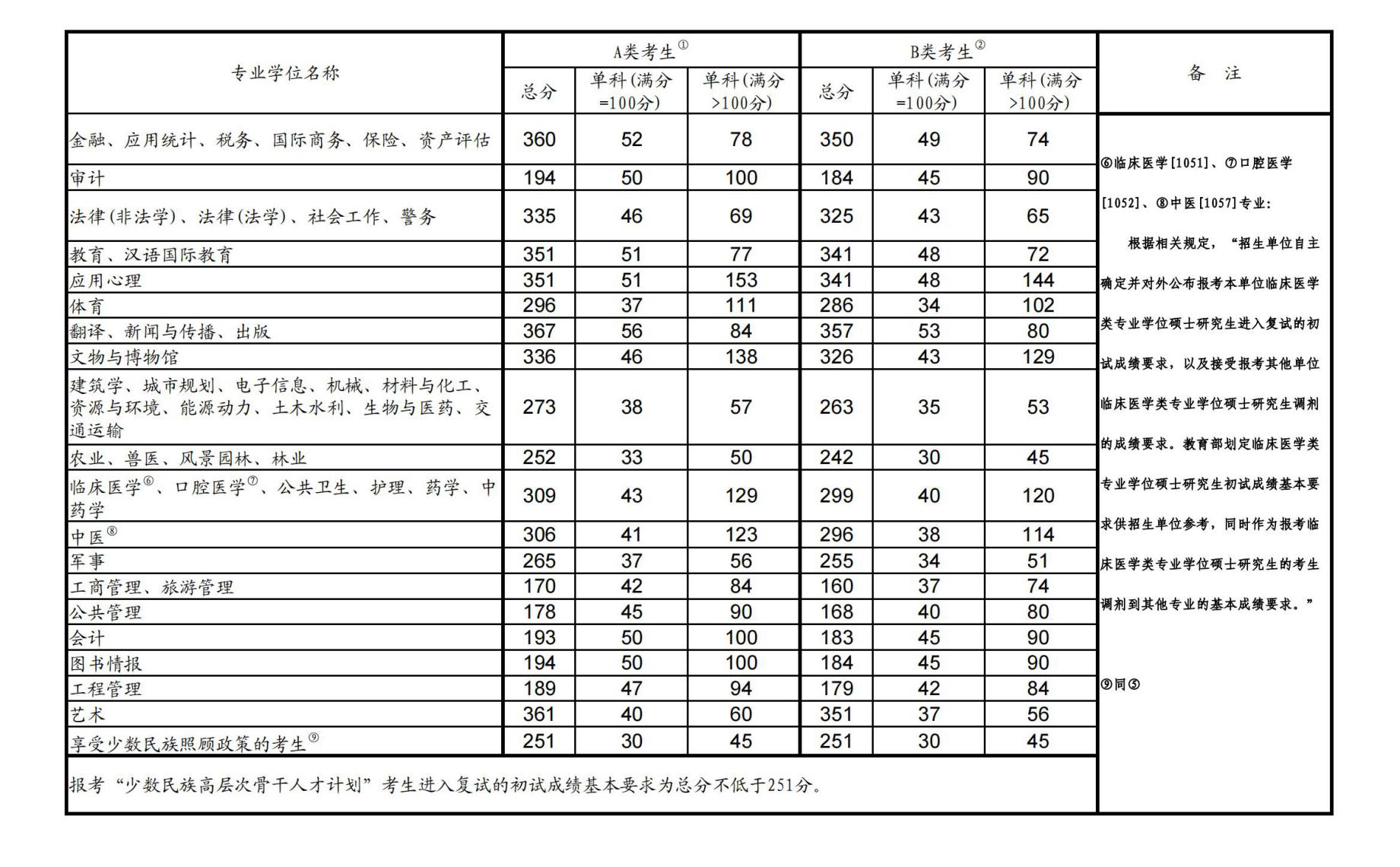 2022年全國碩士研究生招生考試A類考生進入復試的初試成績基本要求(專業學位類)