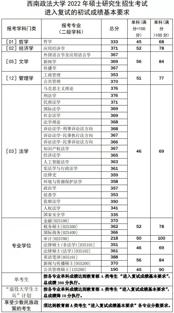 根據教育部2022年劃定的研究生“進入復試成績基本要求”,以及我校各學科專業的生源上線情況,經學校研究生招生工作領導小組研究確定我校進入復試的初試成績基本要求(以下簡稱學校復試線)如下: