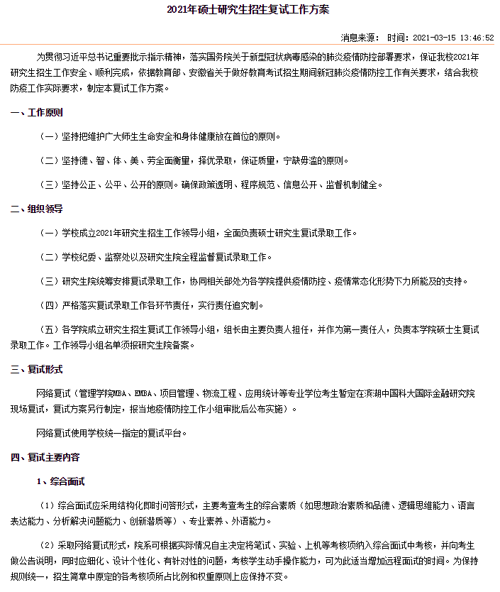 為貫徹習(xí)近平總書(shū)記重要批示指示精神,落實(shí)國(guó)務(wù)院關(guān)于新型冠狀病毒感染的肺炎疫情防控部署要求,保證我校2021年研究生招生工作安全、順利完成,依據(jù)教育部、安徽省關(guān)于做好教育考試招生期間新冠肺炎疫情防控工作有關(guān)要求,結(jié)合我校防疫工作實(shí)際要求,制定本復(fù)試工作方案。