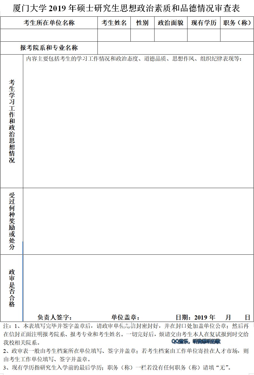 1. 填寫完整并密封完好的《廈門大學(xué) 2019年碩士研究生政治表現(xiàn)情況審查表》(該表可在廈門大學(xué)招生辦網(wǎng)頁:http://zs.xmu.edu.cn 下載) ;