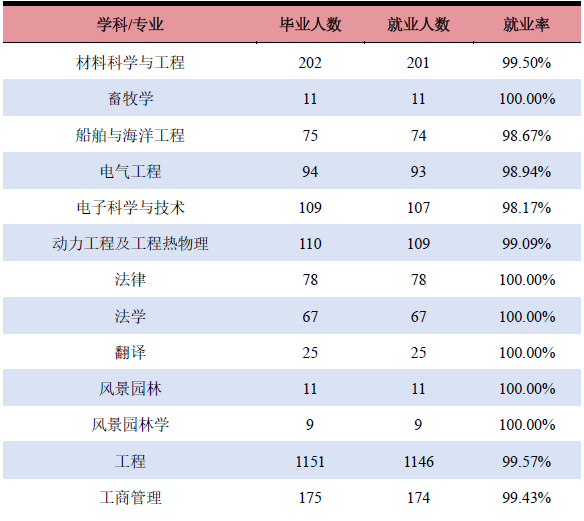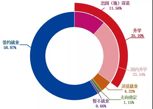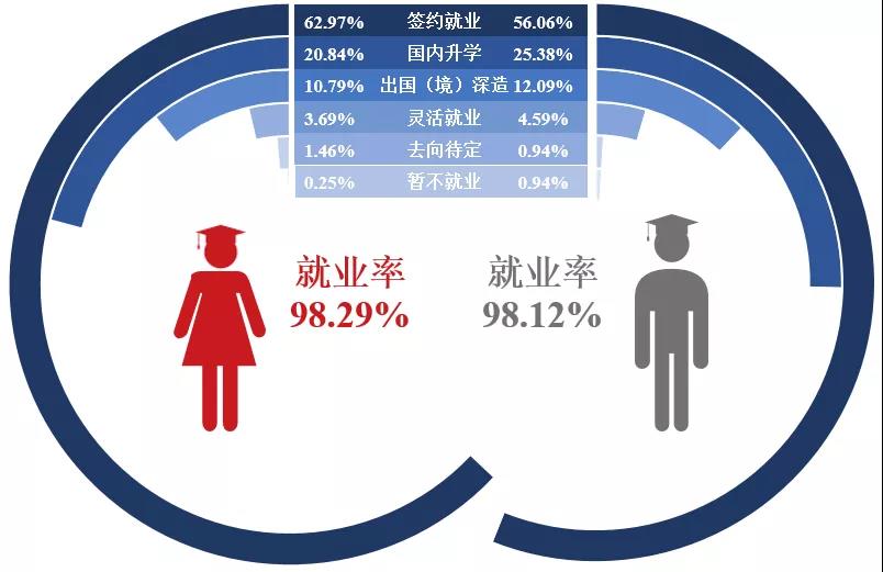 2019年畢業生就業率為98.19%。其中,簽約就業(含博士后)比例為58.87%,國內升學比例為23.54%,出國(境)深造比例為11.56%, 靈活就業比例為4.22%,暫不就業比例為0.66 %,去向待定比例為1.15%。