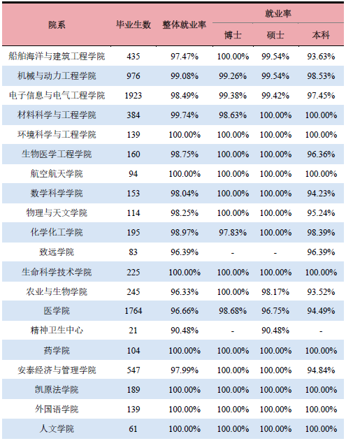 2019年上海交通大學本科、碩士和博士畢業生的就業率均達到96%以上,分別為96.85%、99.06%和99.11%。