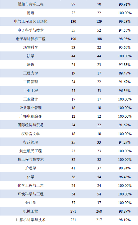 從本科各專業來看,學校61個本科專業,43個專業的就業率達到了95.00%以上,其中有24個專業的就業率達到了100%。