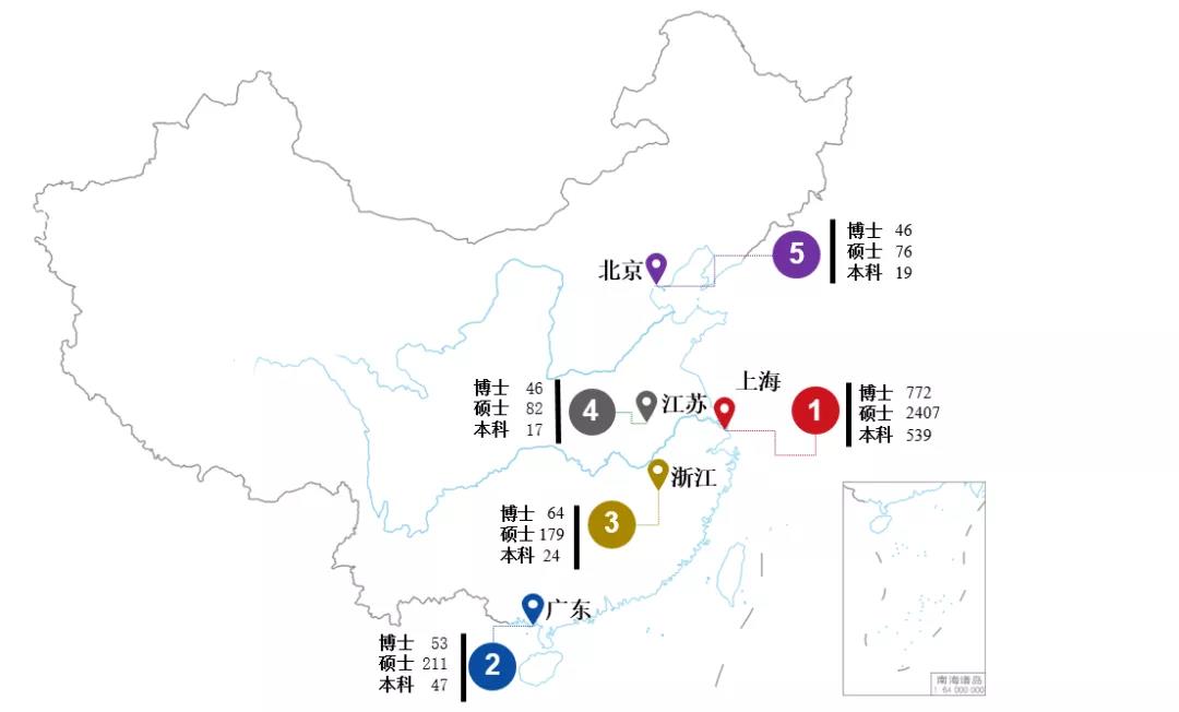 從就業地域來看,上海交通大學畢業生主要就業省市為上海市。博士生、碩士生和本科分別為772人、2407人和539人。除上海市外,我校畢業生就業人數較多的省市依次有:廣東省、浙江省、江蘇省和北京市。畢業生總體更傾向于在東部地區就業。