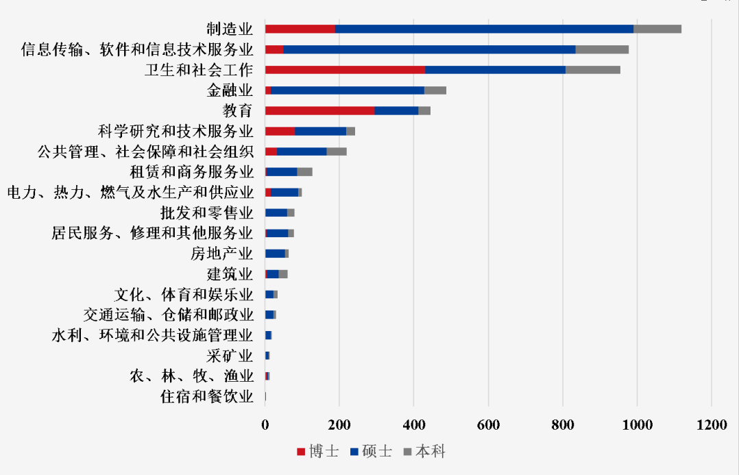 從就業單位所屬行業來看,上海交通大學畢業生最多的三個分別為:制造業;信息傳輸、軟件和信息技術服務業;衛生和社會工作。博士生和本科生到衛生和社會工作的比例最高,碩士生到制造業就業的比例最高。