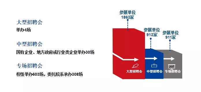 本年度,學校共舉辦946場次各類招聘會,其中大型招聘會4場,國有企業、地方或行業類中型招聘會30場,專場招聘會911場(校級舉辦603場,委托院系承辦308場),共計到校招聘企業有3686家。