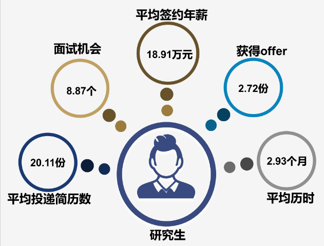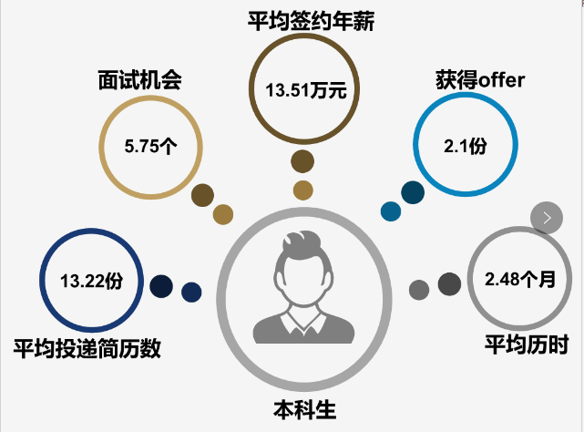 本科生在求職過程中平均投遞簡歷13.22份,獲得5.75個面試機會,獲得2.1份offer,平均歷時2.48個月。研究生平均投遞簡歷20.11份,獲得8.87個面試機會,獲得2.72份offer,平均歷時2.93個月。