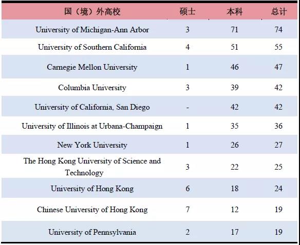 錄取我校畢業生排前三位的國(境)外高校分別是密西根大學(Universityof Michigan)、南加州大學(University of Southern California)和卡內基梅隆大學(Carnegie Mellon University)。