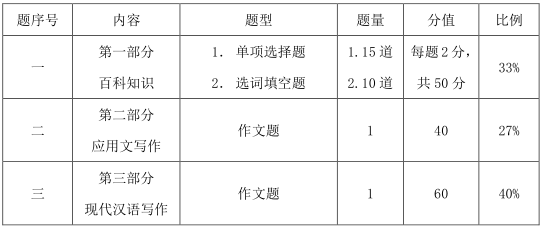 本考試采取客觀試題與主觀試題相結(jié)合,單項(xiàng)技能測(cè)試與綜合技能測(cè)試相結(jié)合的方法,著重考察考生的百科知識(shí)水平和漢語(yǔ)寫作能力。考試包括三個(gè)部分:百科知識(shí)、應(yīng)用文寫作、現(xiàn)代漢語(yǔ)寫作。考試時(shí)間共計(jì) 3 小時(shí)。