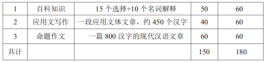 本考試包括三個(gè)部分:百科知識(shí)、應(yīng)用文寫作、命題作文。總分 150 分。