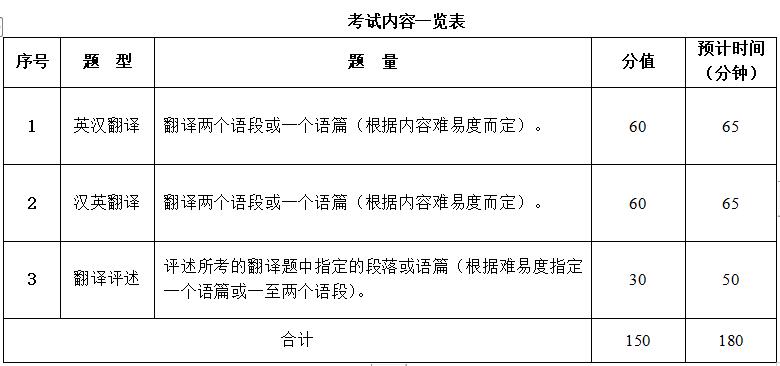 考試內容包括三個部分:英漢翻譯、漢英翻譯、翻譯評述(詳見“考試內容一覽表”)。