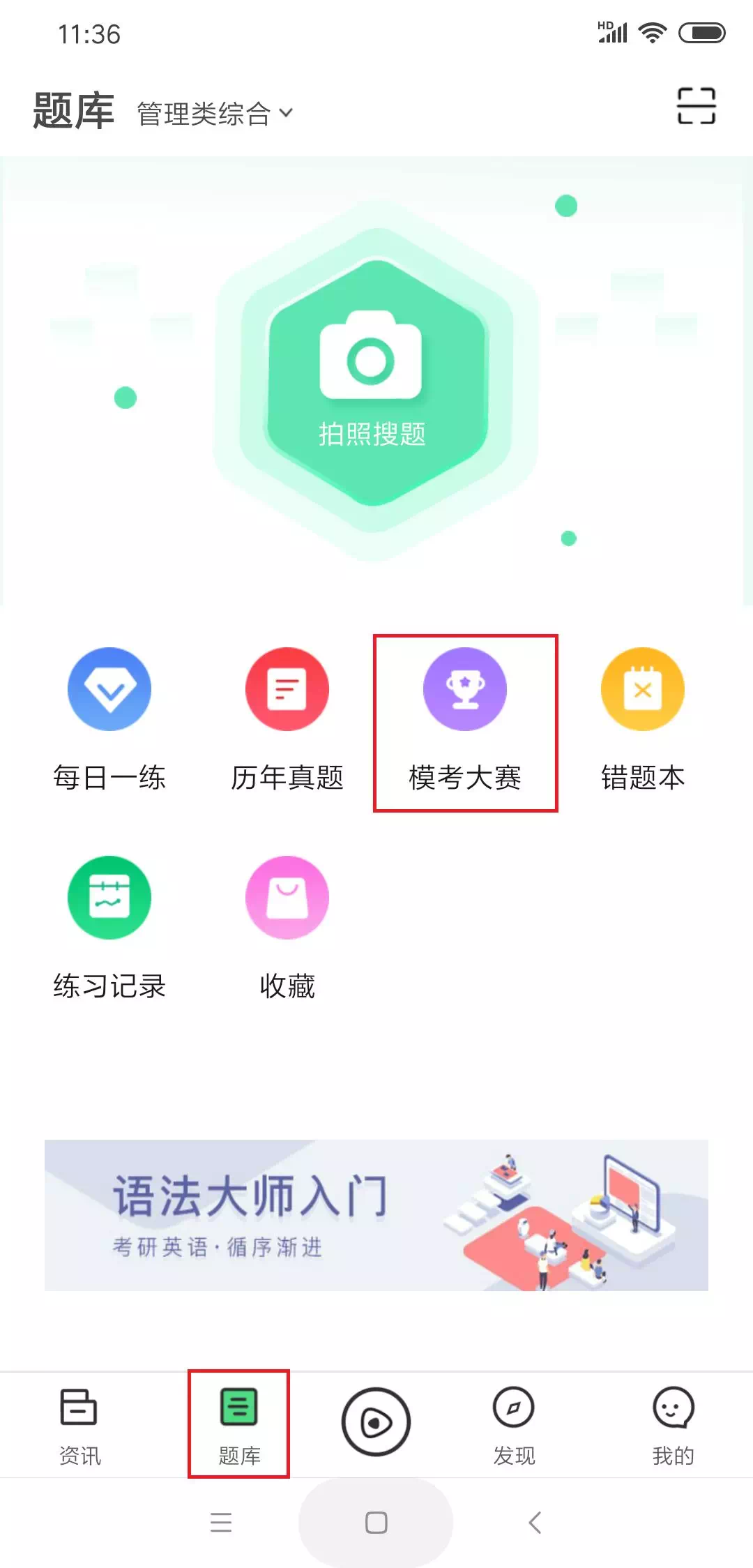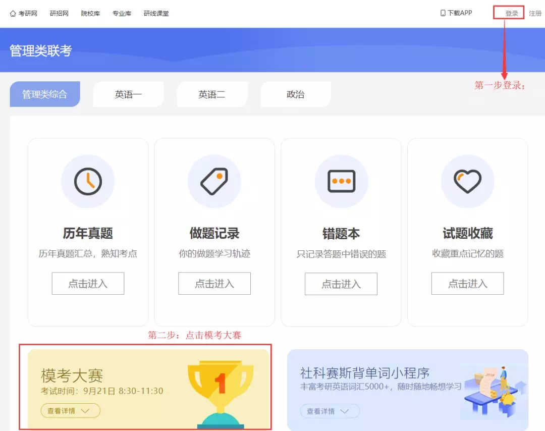 登錄成功后,點擊題庫->模考大賽,即可參加,建議同學們備好草稿紙。