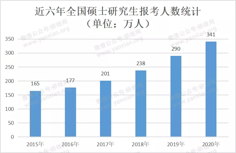 根據(jù)研招網(wǎng)《2019年全國碩士研究生招生數(shù)據(jù)報告》來看,考研報考人數(shù)從2015年開始呈現(xiàn)一個持續(xù)增長的態(tài)勢,2019年報名人數(shù)290萬人,較上一年激增52萬人,增幅達21.85%,2020年報考人數(shù)341萬,較2019年增減51萬,增幅達17.59%,2020年或?qū)?00萬。