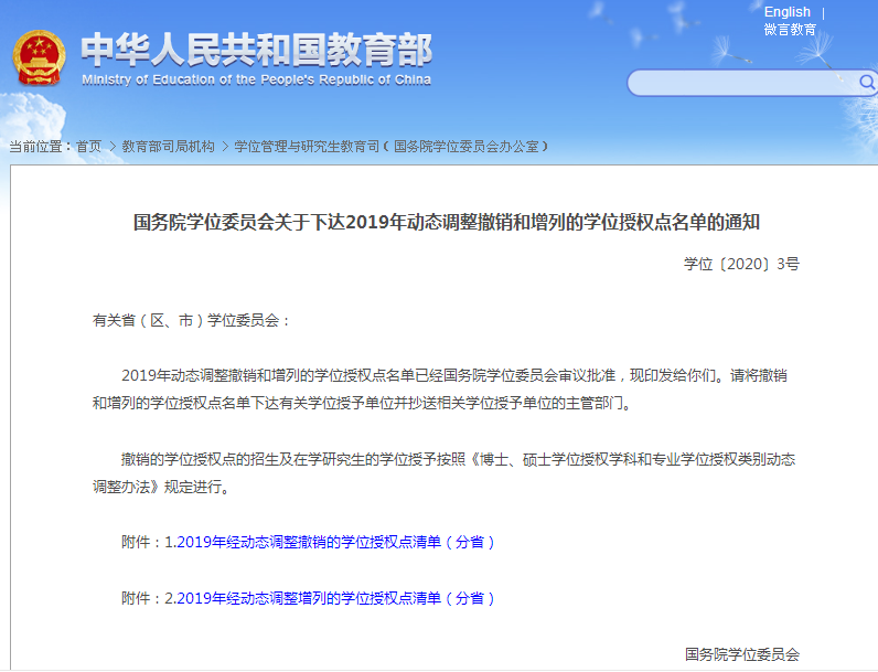 4月2日,學位管理與研究生教育司在教育部官網發布了《國務院學位委員會關于下達2019年動態調整撤銷和增列的學位授權點名單的通知》,公布了2019年動態調整撤銷和增列的學位授權點名單。原文如下: