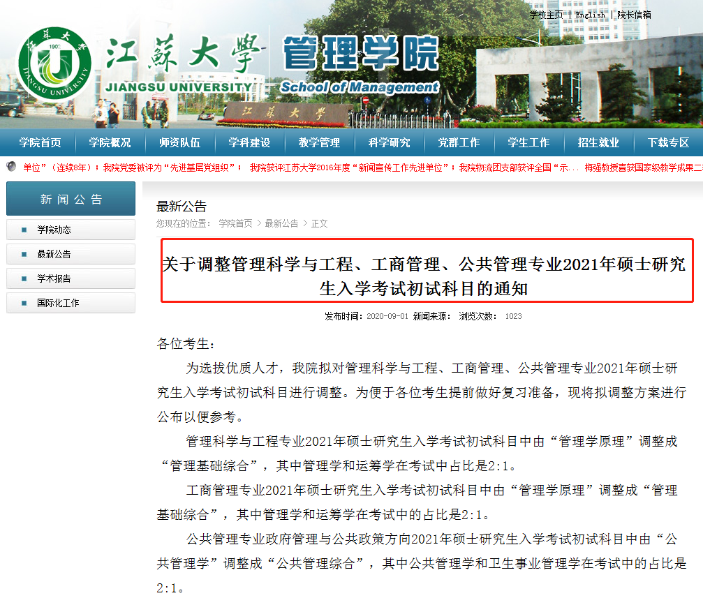 昨日,江蘇大學(xué)管理學(xué)院公布了《關(guān)于調(diào)整管理科學(xué)與工程、工商管理、公共管理專業(yè)2021年碩士研究生入學(xué)考試初試科目的通知》。學(xué)院擬對管理科學(xué)與工程、工商管理、公共管理專業(yè)2021年碩士研究生入學(xué)考試初試科目進(jìn)行調(diào)整。