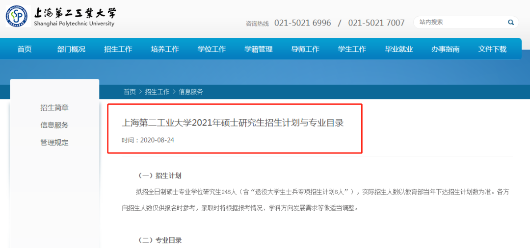 上海第二工業(yè)大學(xué)公布2021年碩士研究生招生計劃與專業(yè)目錄。