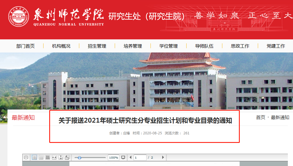 泉州師范大學(xué)發(fā)布《關(guān)于報送2021年碩士研究生分專業(yè)招生計劃和專業(yè)目錄的通知》。