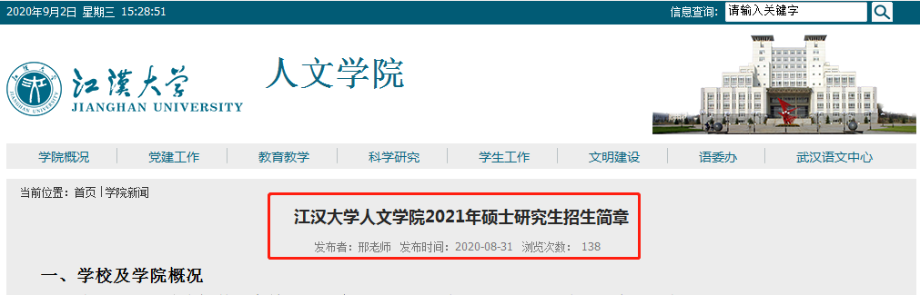 江漢大學(xué)人文學(xué)院發(fā)布2021年碩士研究生招生簡章。