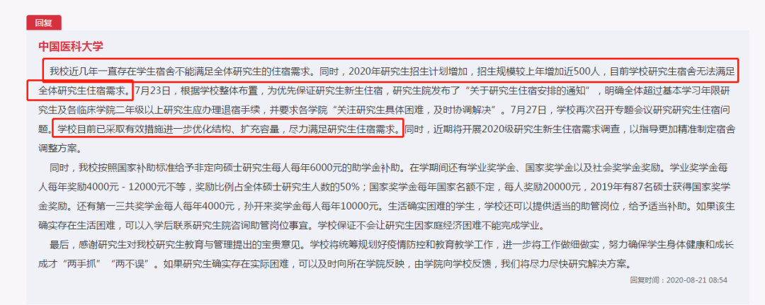 中國醫(yī)科大學(xué)的研究生新生在人民網(wǎng)領(lǐng)導(dǎo)留言板反映由于宿舍緊張,僅給全日制臨床醫(yī)學(xué)學(xué)碩提供一年住宿,該同學(xué)表示家庭經(jīng)濟原因,無力承擔(dān),有可能放棄入學(xué)的機會。校方相關(guān)負(fù)責(zé)人對這個問題進(jìn)行了回答: