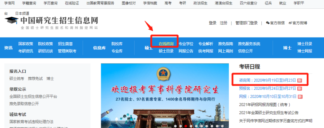 參與方式:研招網首頁頂部“在線咨詢”(如上圖)