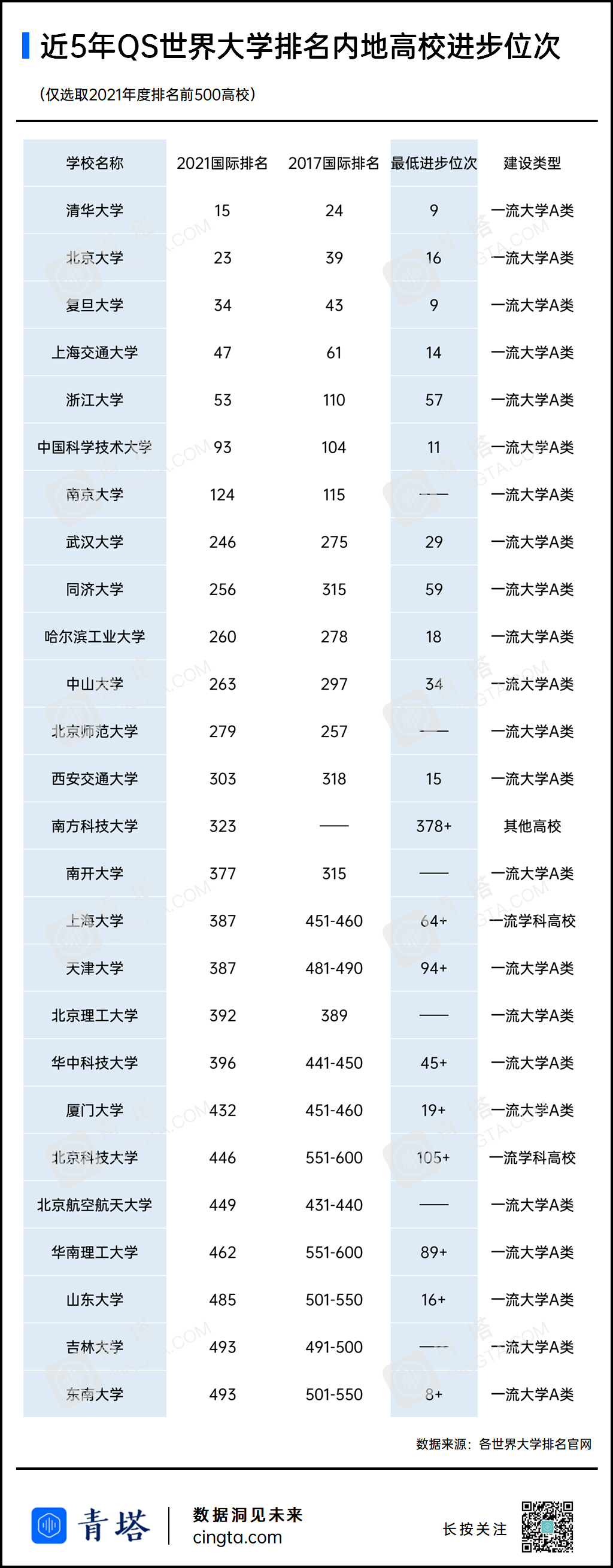 近期,青塔匯總了U.S.News 世界大學排名,QS世界大學排名和泰晤士高等教育世界大學排名(THE) 中,中國內地高校上榜情況。以下是“最高上升500名+!近5年,哪些高校國際排名進步最快?”的原文內容。