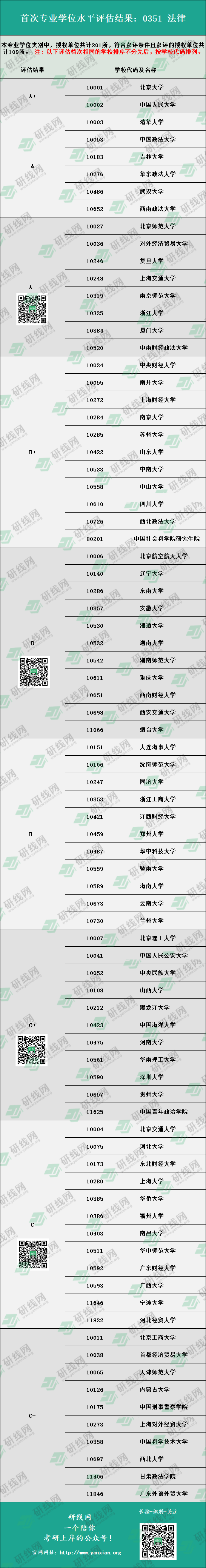 下面是全國首次專業學位水平評估結果中0351 法律的院校排名,供大家擇校參考。
