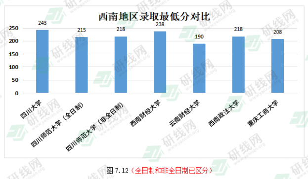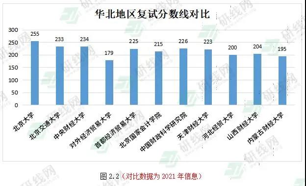 以華北地區院校復試分數線為例,北京大學、中央財經大學、北京交通大學高居前三名,低于200分的院校為對外經濟貿易大學和內蒙古財經大學。整體來看,華北地區院校復試分數線普遍較高。
