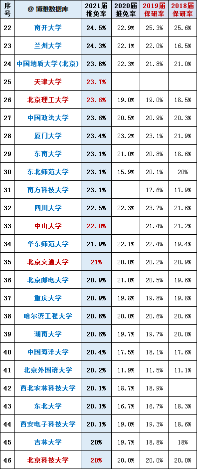 多數情況下,雙一流院校、優勢學科、基礎學科院校推免率偏高。在@博雅數據庫推免率top100院校排名表中(如下圖)可以看到,清華、北大2020年保研率均超過50%。