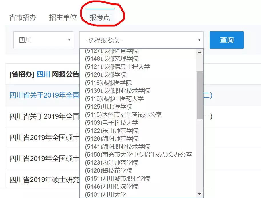 打開中國研究生招生信息網官網,首頁菜單選擇【網報公告】點擊進入之后,按照下圖,一定要選擇自己報名時選的報考點,點擊查詢就可以看到啦!