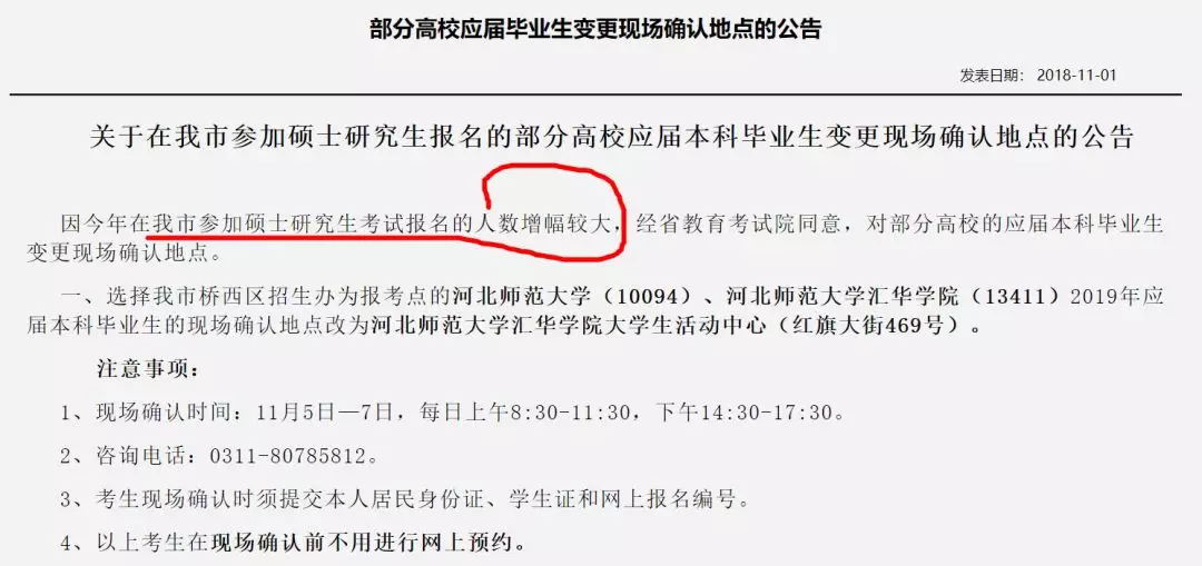 近期,石家莊教育考試院就發布公告,因為今年考試報名人數增幅較大,對部分高校應屆本科畢業生變更現場確認地點。在石家莊報考的小伙伴們注意到查看相關信息。