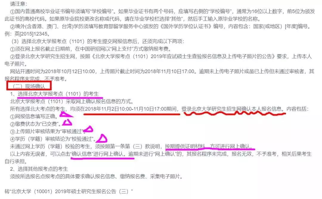 所有選擇北大考點的考生,均須在2018年11月2日10:00-11月10日17:00期間,登錄北京大學研究生招生網進行本人報名信息確認。注:11月8日至10日不設現場確認,不受理補交報名費。