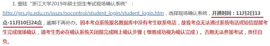 浙江大學報考點11月2日13點至10日24點(逾期不再補辦),登陸“浙江大學2019年碩士招生考試現場確認系統”,填寫信息,上傳照片,網上繳費等按要求完成網上確認。考生繳費成功后視為確認完成,否則無法參加考試。