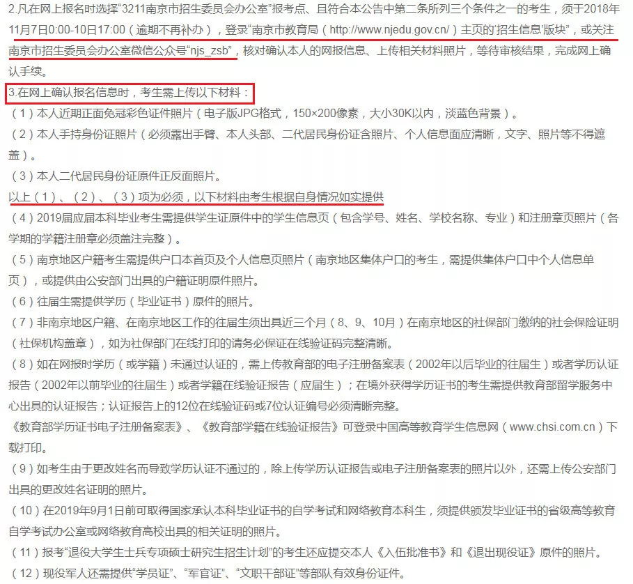 須于2018年11月7日至11月10日(逾期不再補辦),登錄南京市教育局主頁或南京市招生委員會辦公室微信公眾號“njs_zsb”,修改核對本人的網報信息、上傳本人證件照片、上傳身份證等其他相關材料照片,等待審核結果,完成網上確認手續。