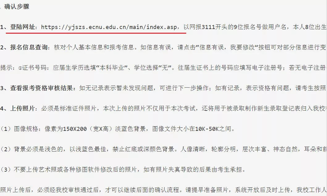 凡是符合選擇華東師范大學考點(代碼3111)條件的考生網上報名后,于11月6日至10日按要求上傳照片進行網上確認,收費系統11月6日不開放,于11月7日開放。