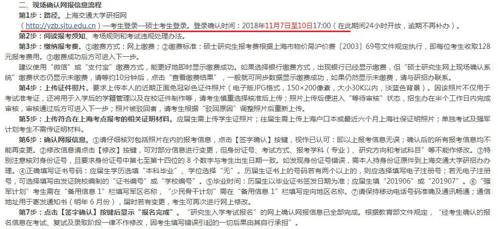 考生均須在上海交通大學研招網上對本人報名信息進行報名確認。上海交通大學考點的網上確認時間為:2018年11月7日至10日17:00,考生按網上確認要求和步驟進行網報確認。
